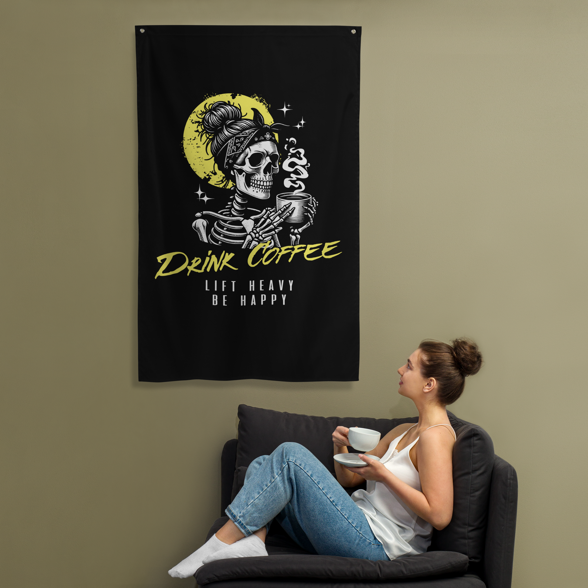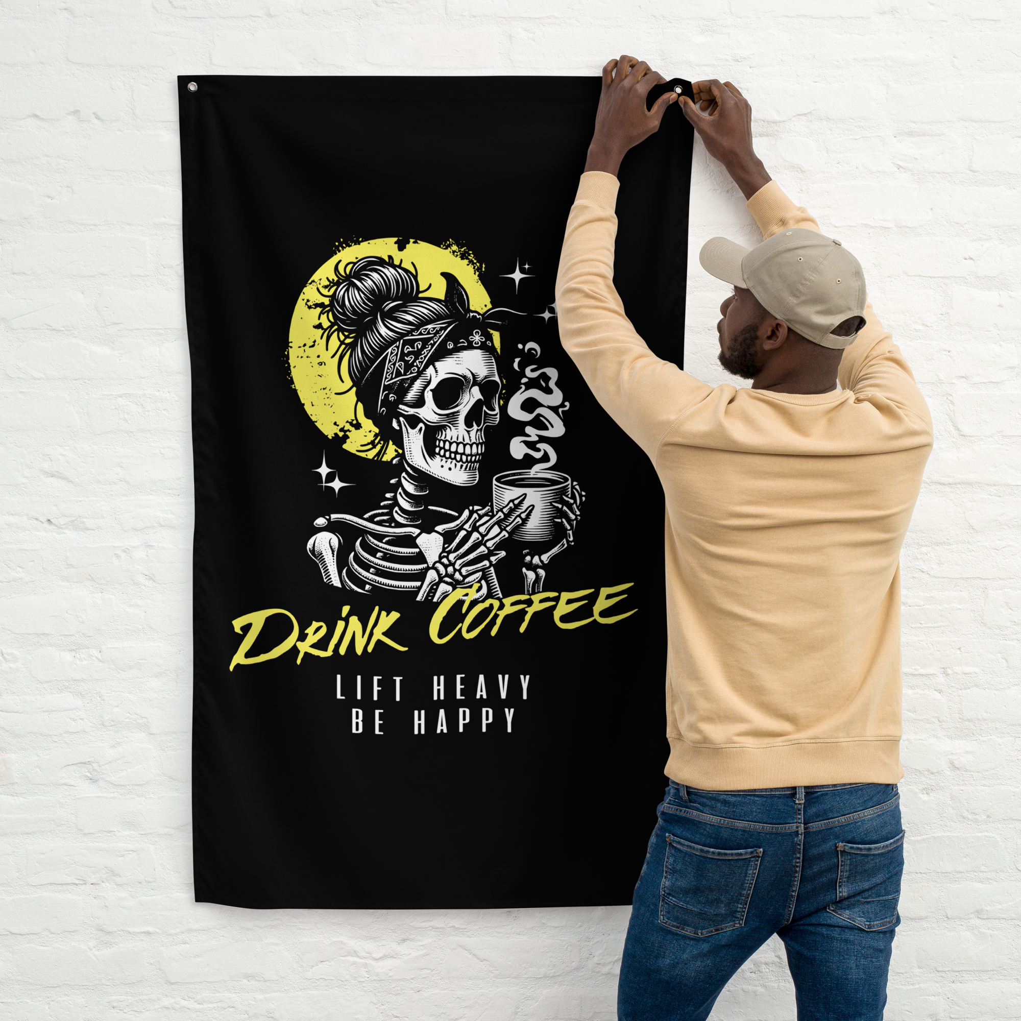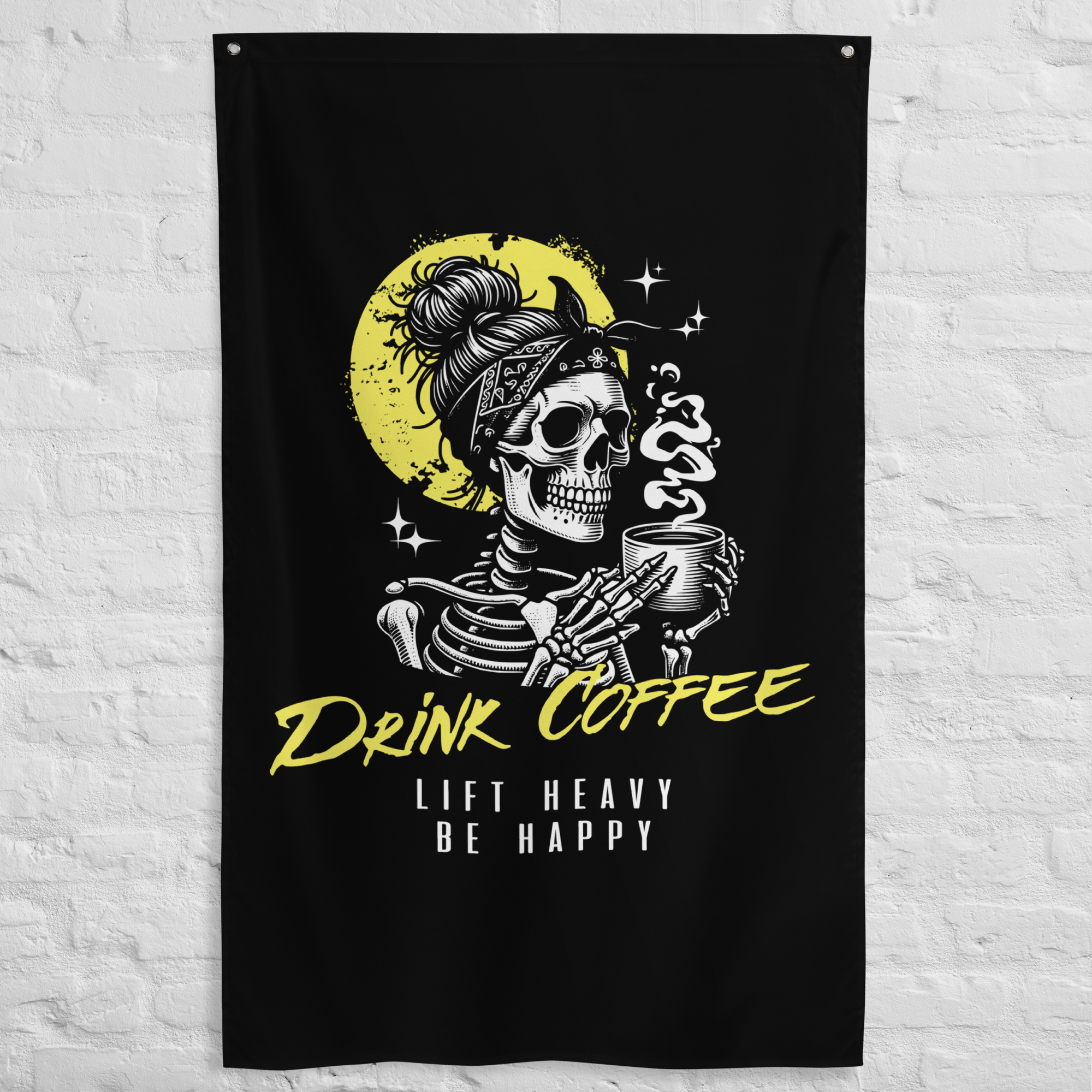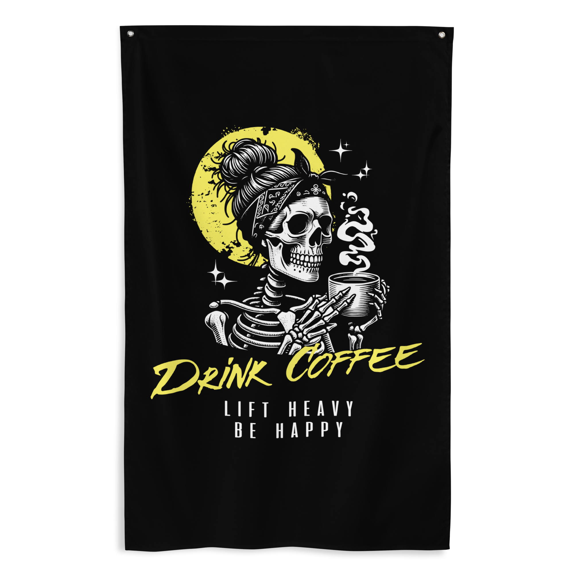A gym flag to inspire coffee drinkers and heavy lifters. The perfect motivational lifting banner to add to your home, garage or powerlifting gym. Add some character and lifting inspiration to your space with a unique gym flag that speaks to what you love doing... lifting heavy weights. Your flag is durable and won’t fade or shrink thanks to the polyester material. It's washable and you can iron it, giving this gym flag a fresh crisp look for a long lasting lifespan.