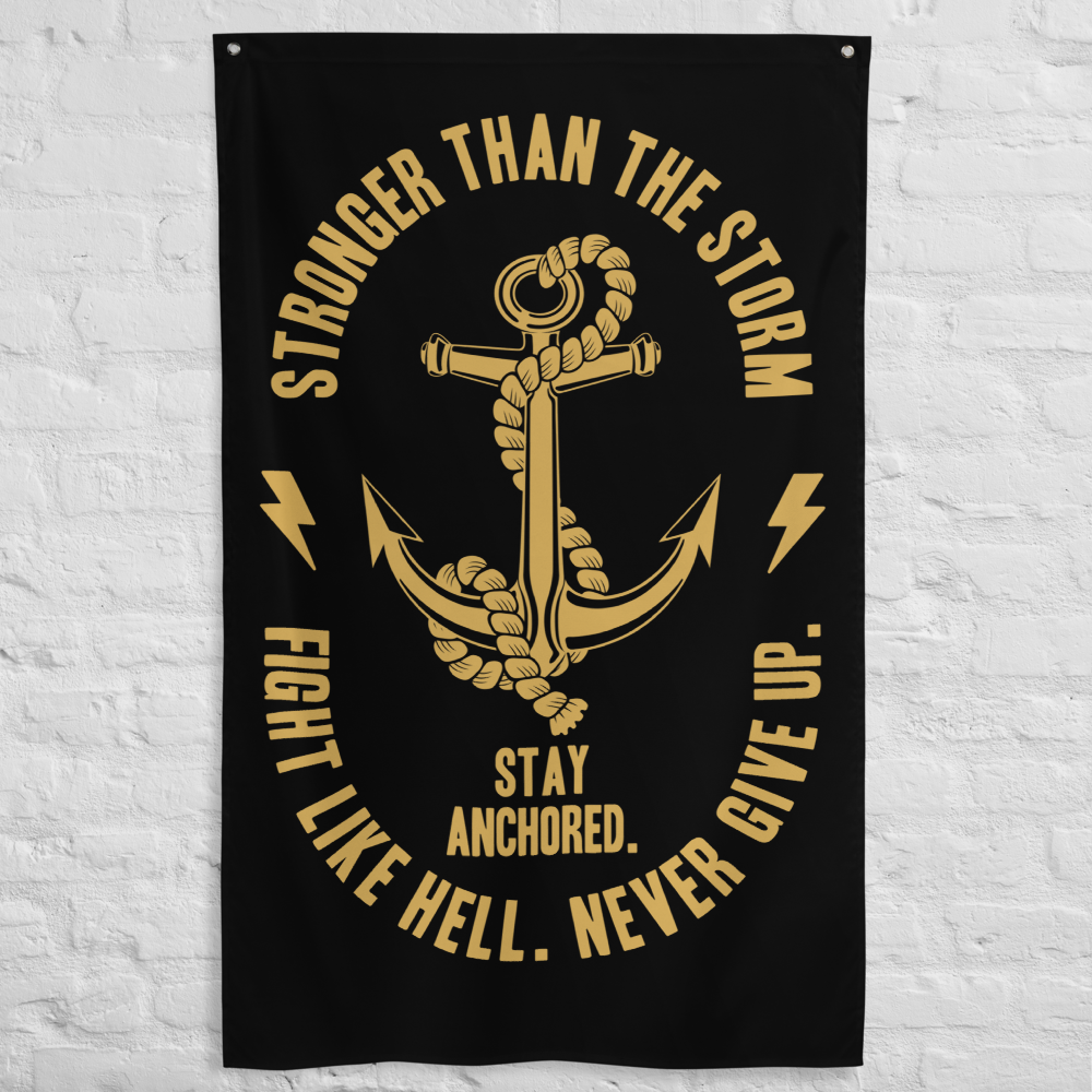 A motivational gym flag that keeps you going throw the tough times. You are Stronger than the Storm. Stay Anchored, Fight Like Hell and Never Give Up. Your flag is durable and won’t fade or shrink thanks to the polyester material. It's washable and you can iron it, giving this gym flag a fresh crisp look for a long lasting lifespan.